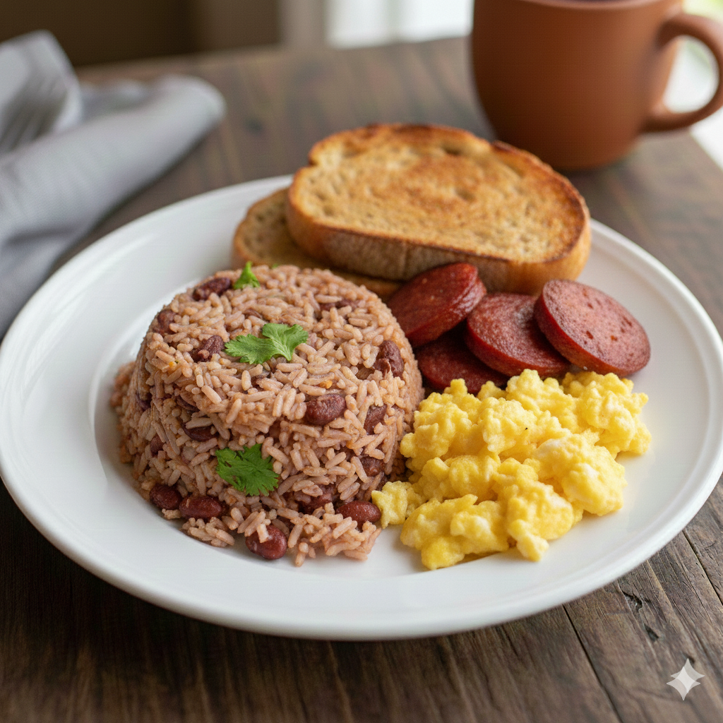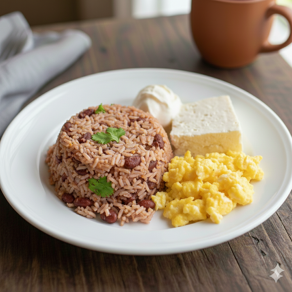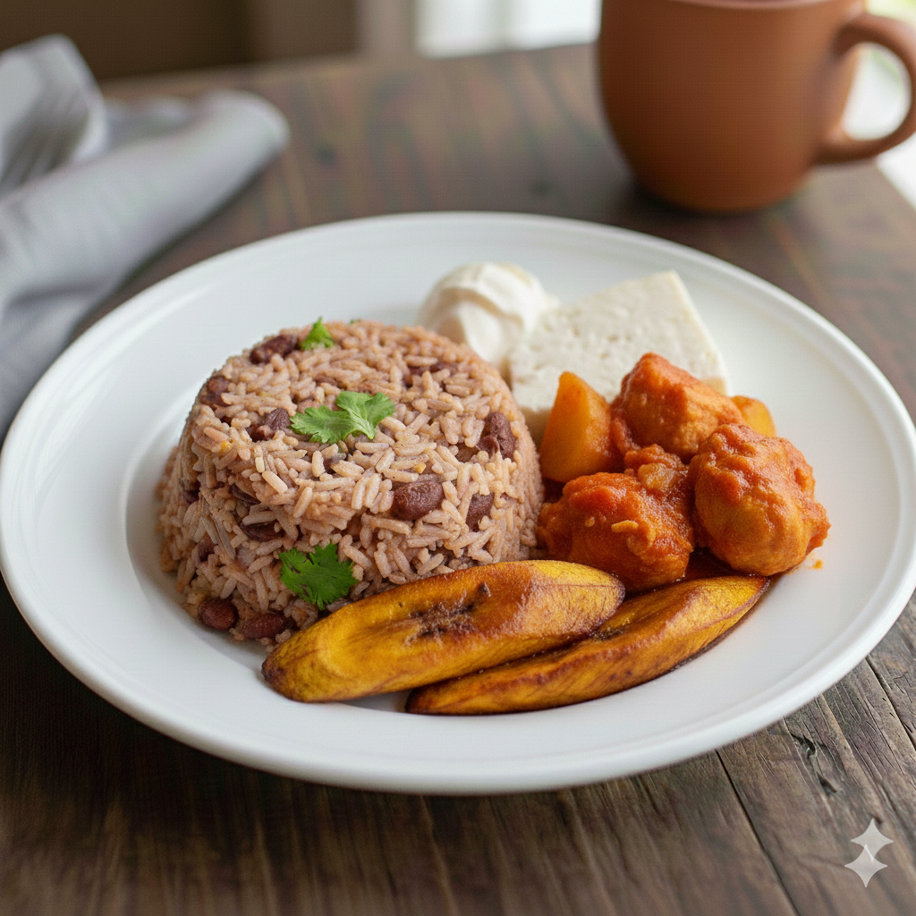 Pinto, maduro, pollo en salsa y queso.