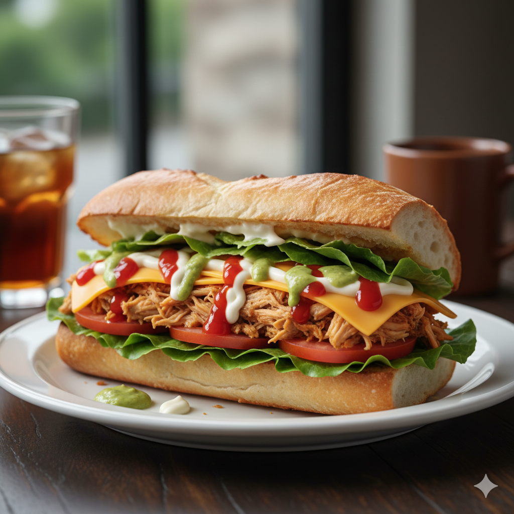 Deliciosos sandwich con tomate, lechuga, salsas, queso amarillo y pollo arreglado.