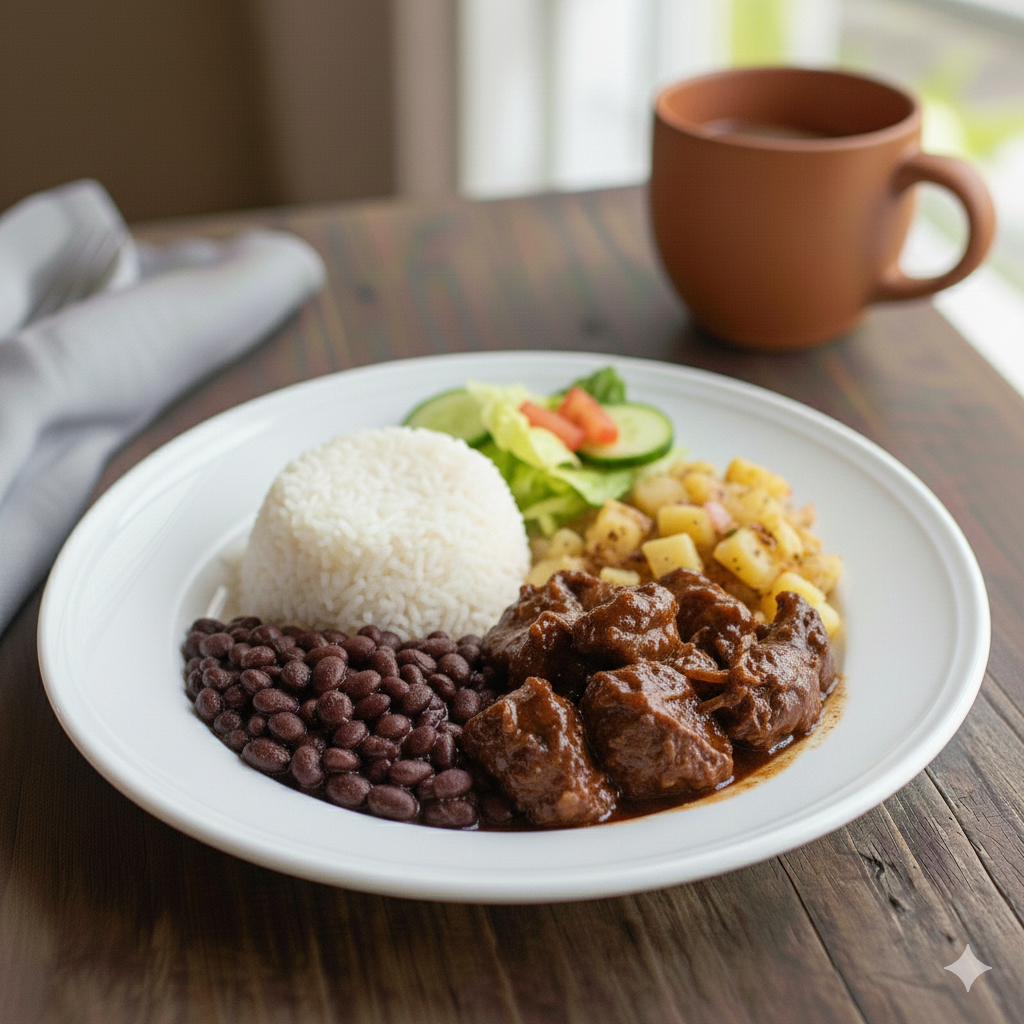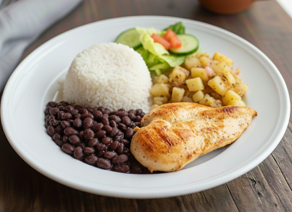 Porciones grandes de arroz, frijoles, ensalada, picadillo, plátano maduro o tortilla.