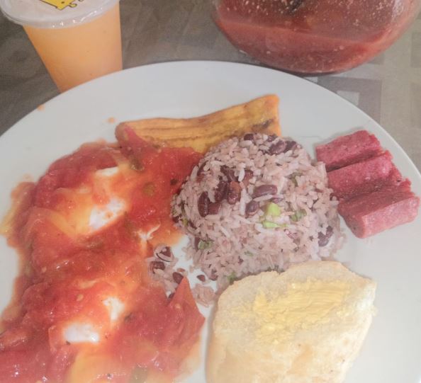 Pinto, huevos rancheros, salchichon, platano maduro y refresco de la casa