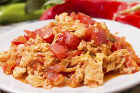 huevos revueltos con tomate y cebolla acompañados con dos tostadas de pan cuadrado
