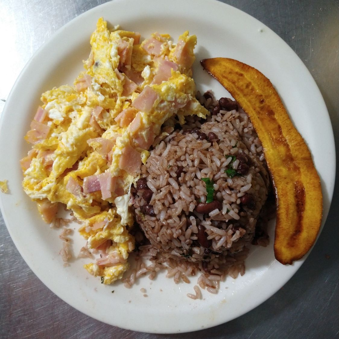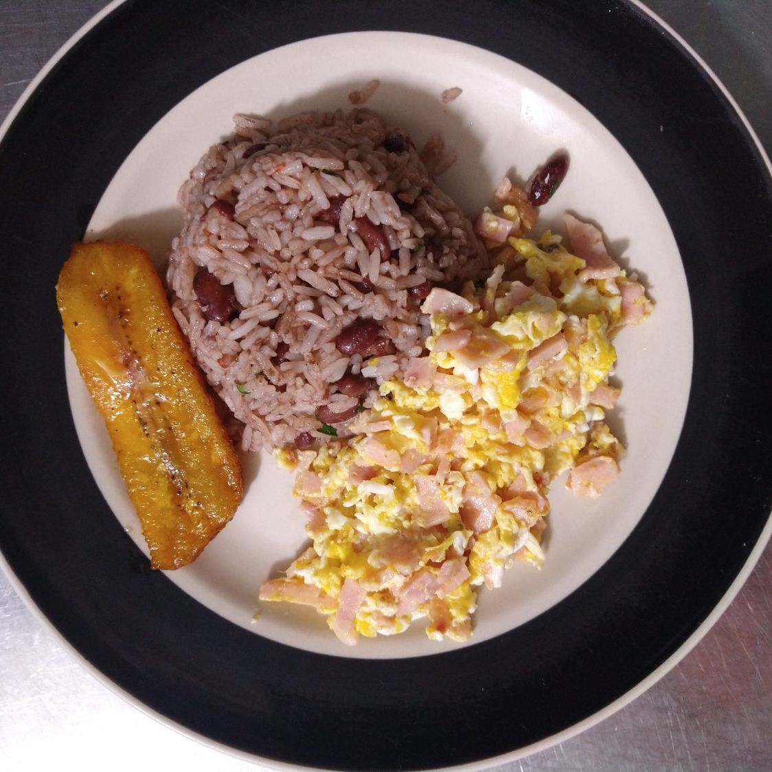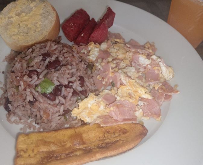 Pinto con Huevos con Jamon, salchichon, platano maduro