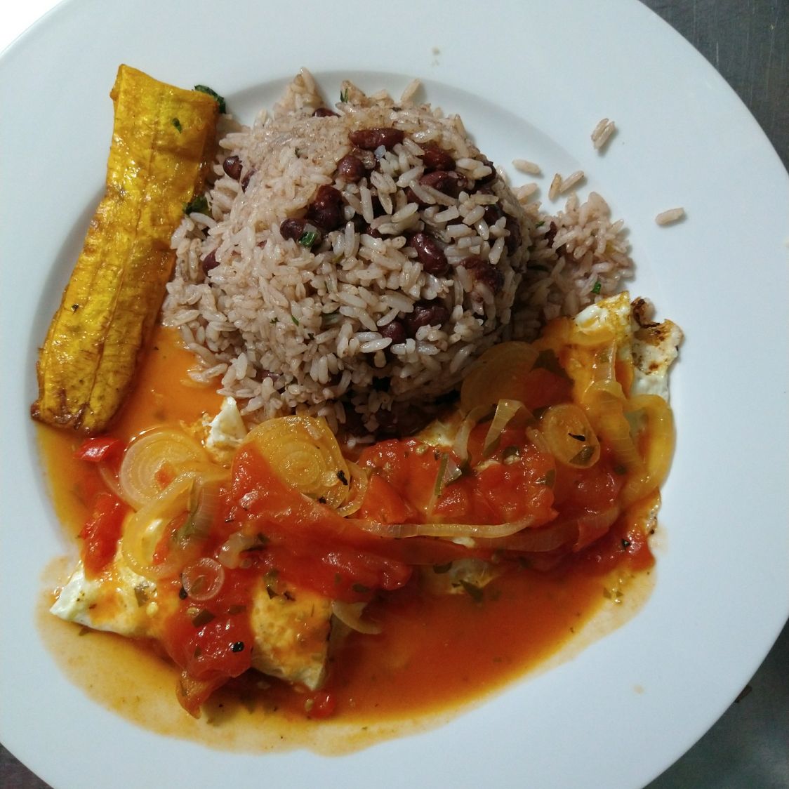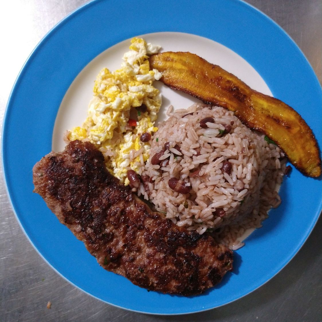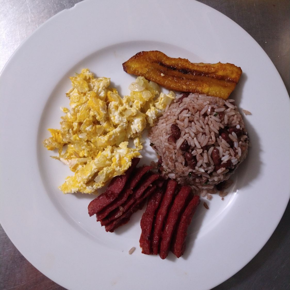 Pinto con Huevos con Jamon, salchichon, platano maduro