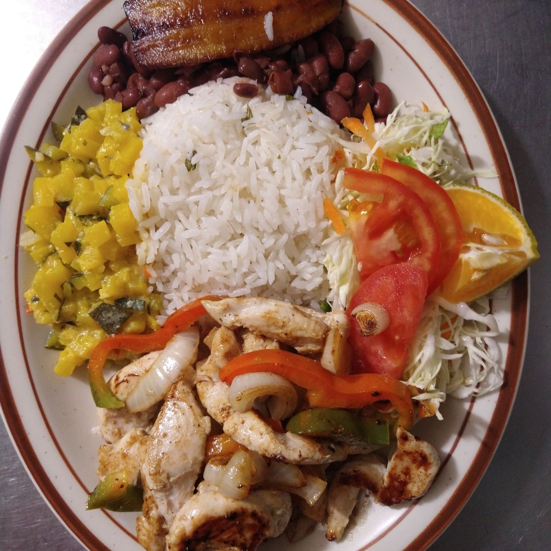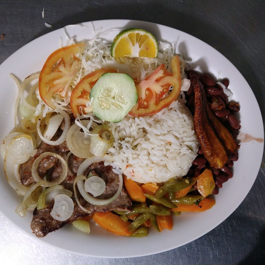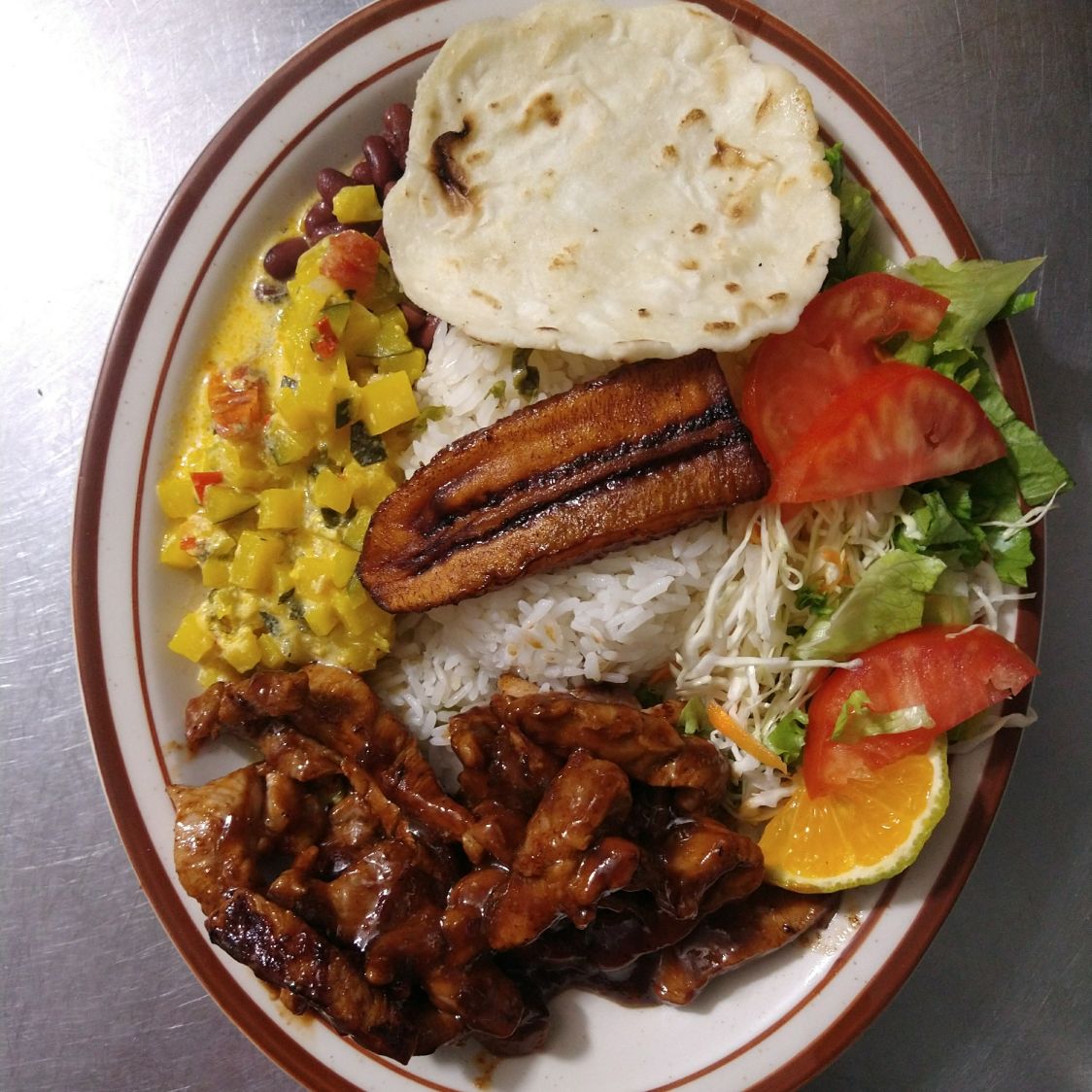 arroz, frijoles y dos acompañamientos y la carne