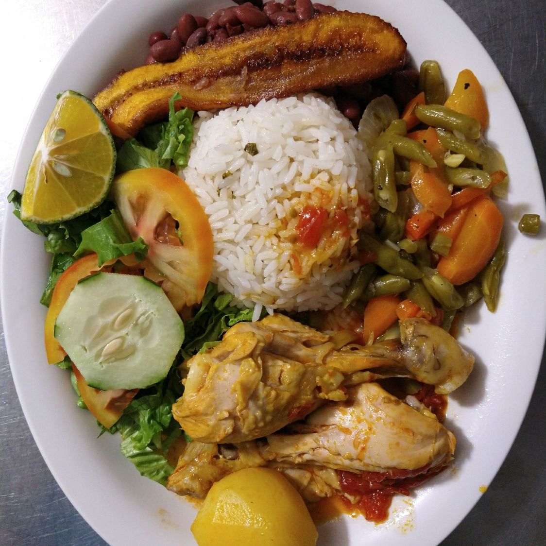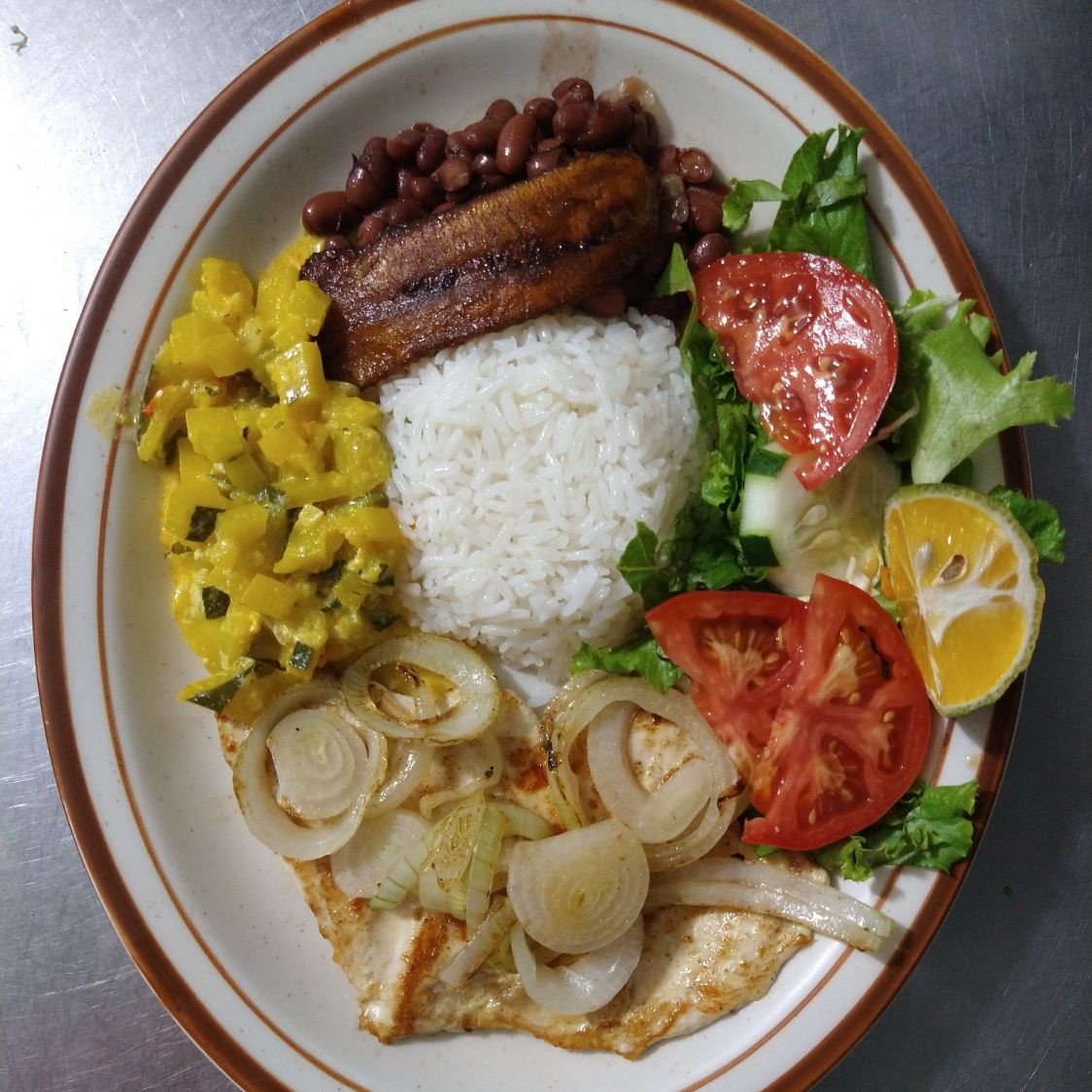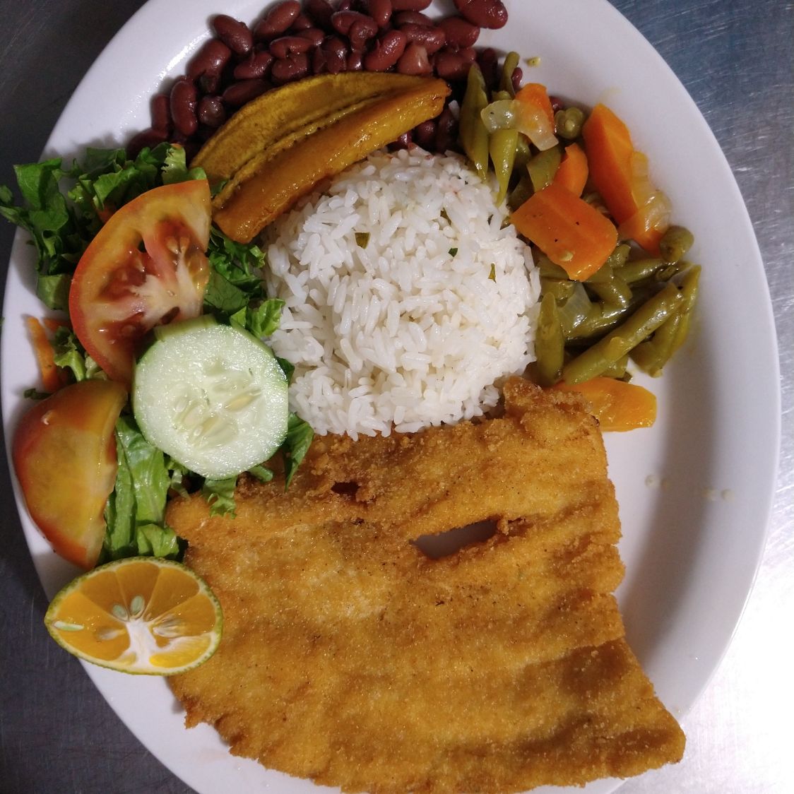 arroz, frijoles y dos acompañamientos y la carne