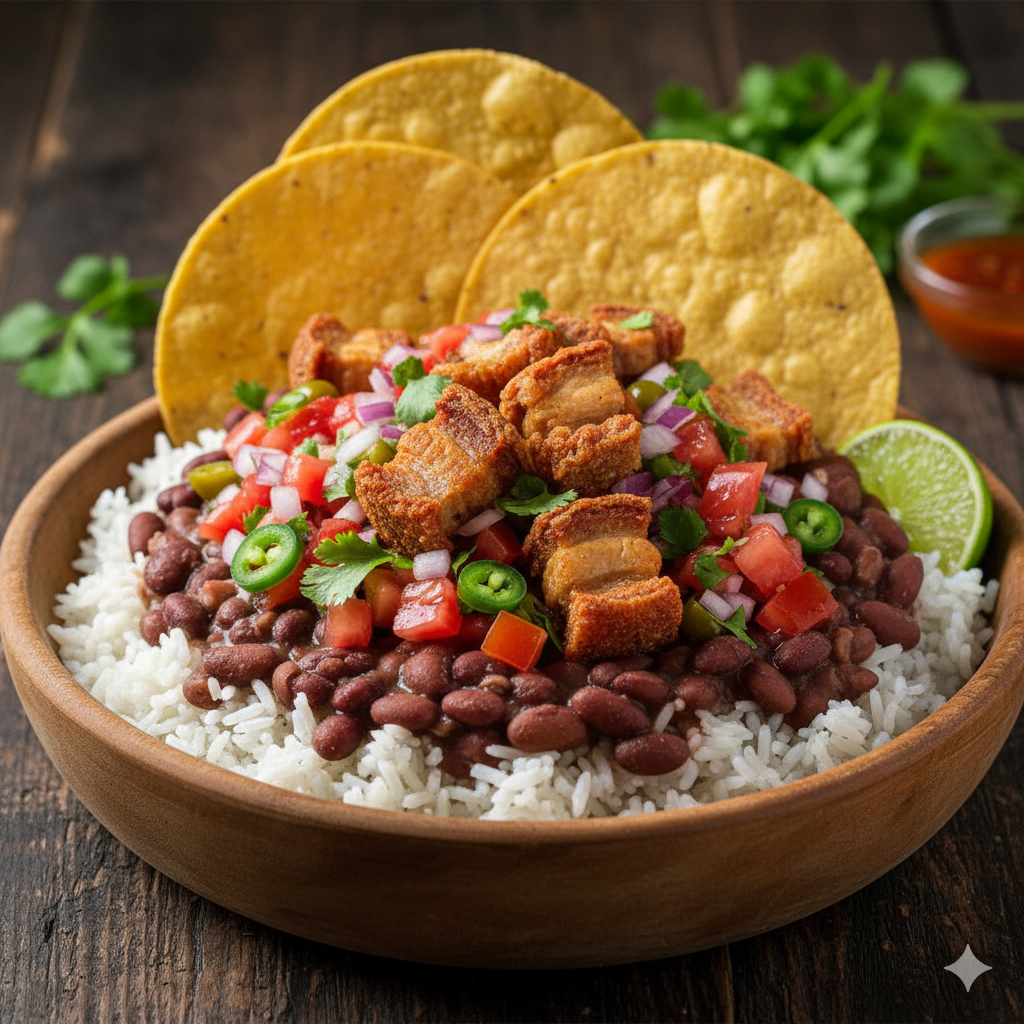 Arroz, frijoles, pico de gallo, tortillas tostadas, chicharrón.