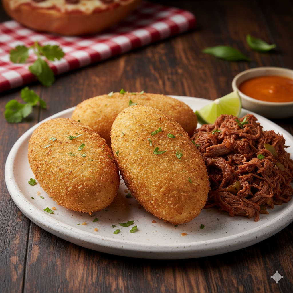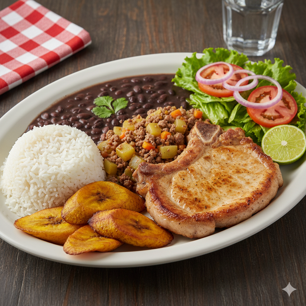 Arroz, frijoles, picadillo, plátano maduro, proteína y ensalada.