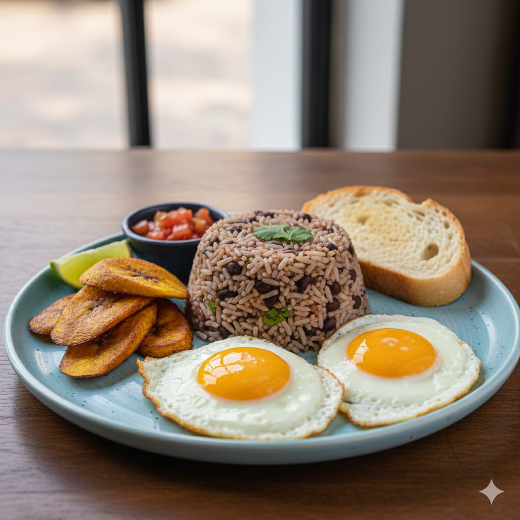 Pinto, huevo, plátano maduro, pan.