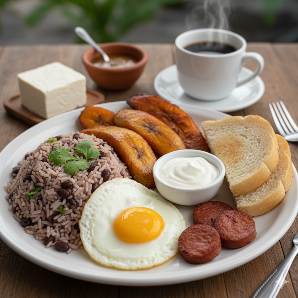 Pinto, huevo, plátano maduro, natilla o queso, salchichón y pan.