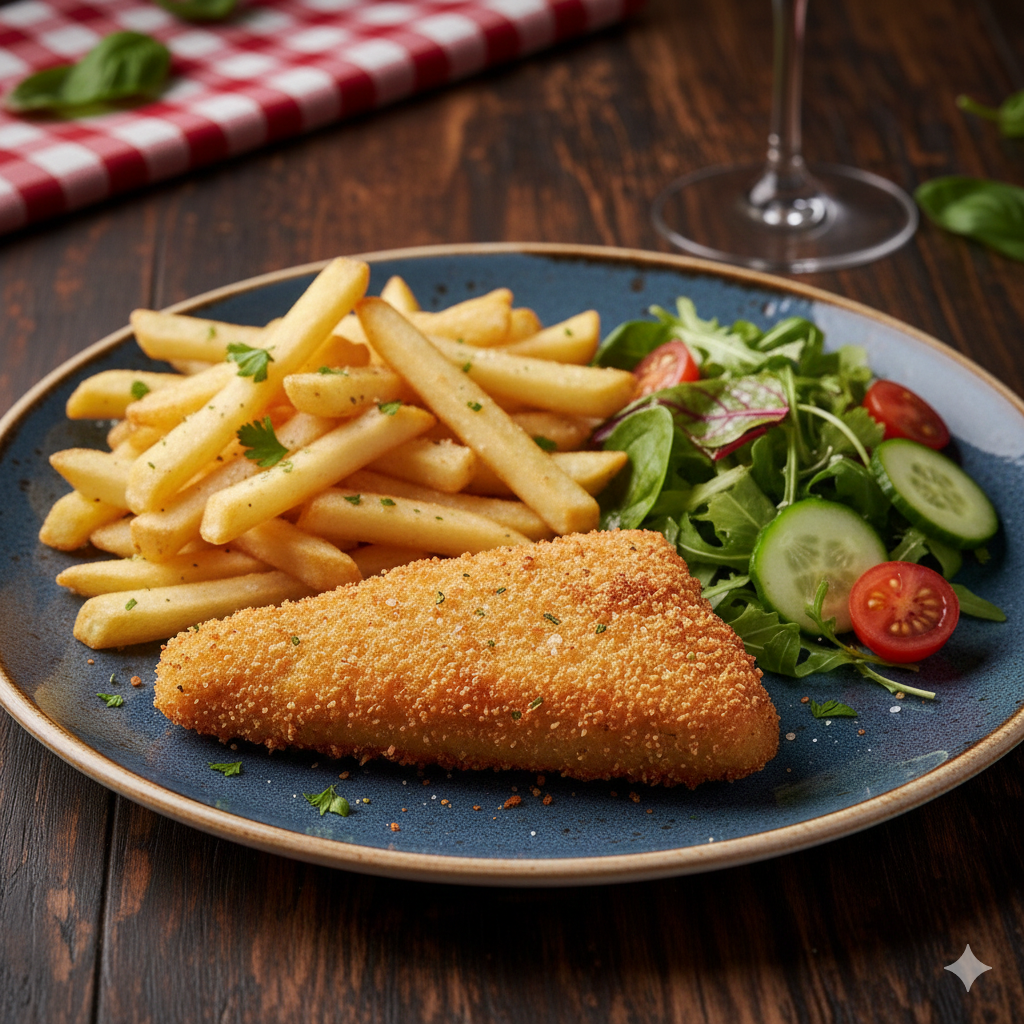 Pequeño acompañado con papas y ensaldas.
