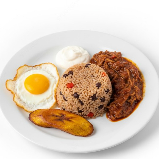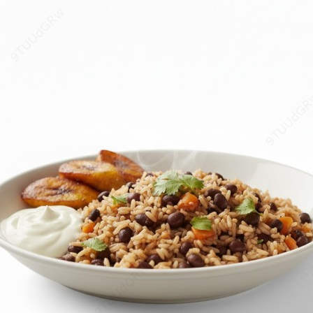 Tradicional gallo pinto con arroz y frijoles, acompañado de natilla o plátano maduro.