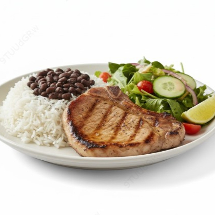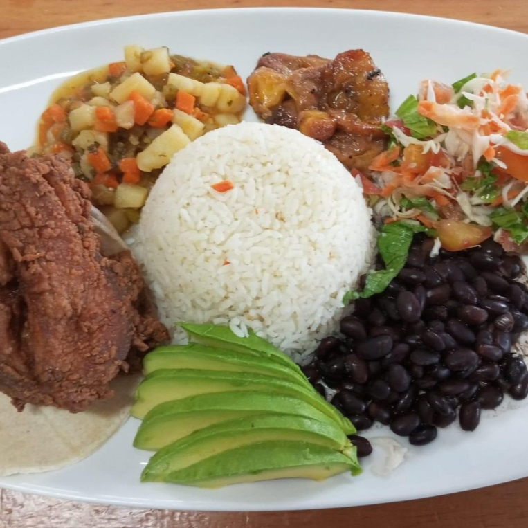 Plato típico con arroz, frijoles, ensalada, plátano maduro y carne a elección.