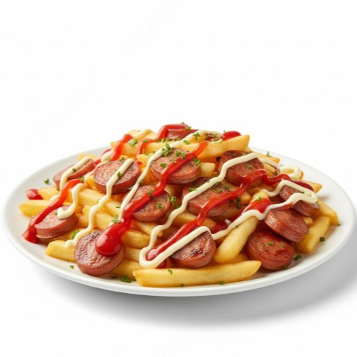 Mezcla de papas fritas con salchichas y salsas variadas.