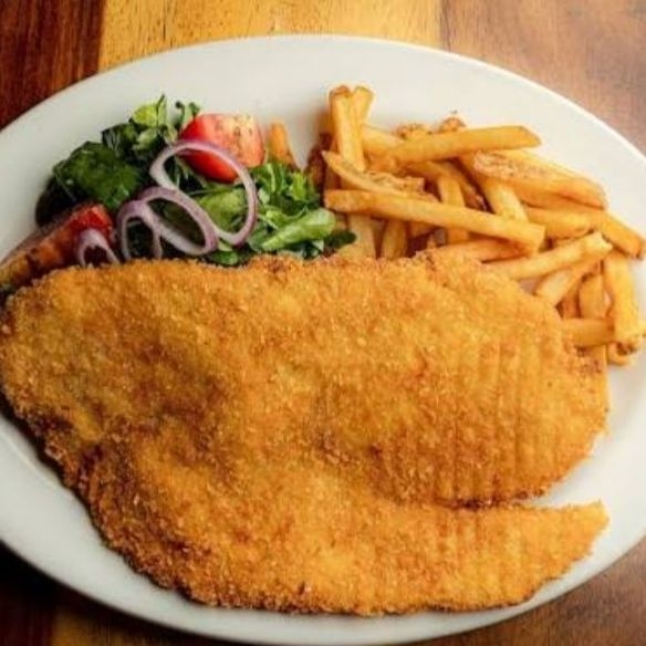 Gallo pescado, ensalada de lechuga y tomate, papas fritas.