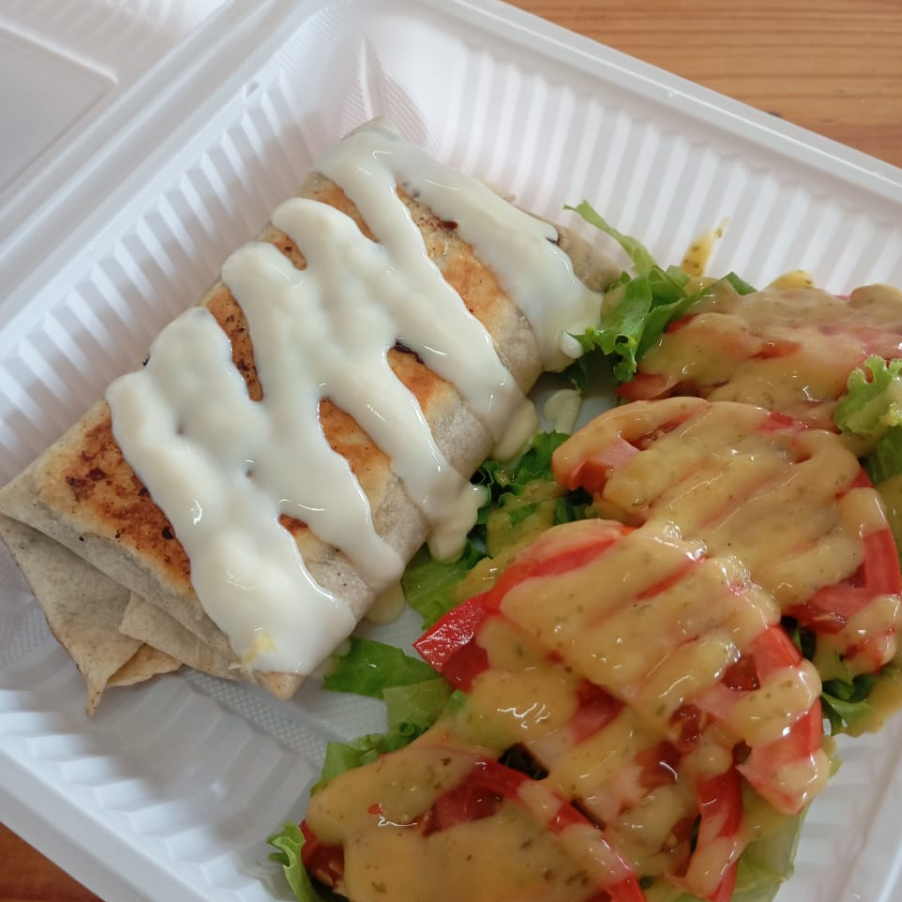 Tortilla de harina rellena con arroz, frijoles, carne y vegetales frescos.