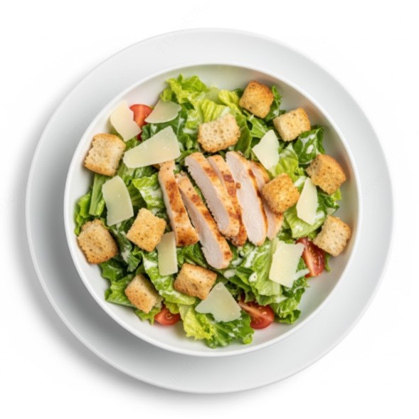 Ensalada de lechuga, pollo, queso, crutones y aderezo César.