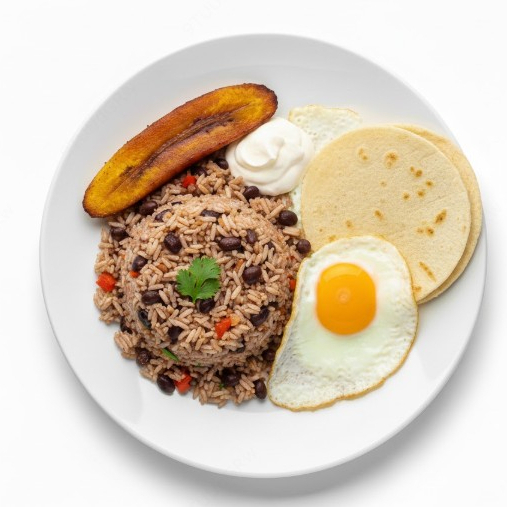 Gallo pinto con huevo, plátano maduro, natilla y pan o tortilla.