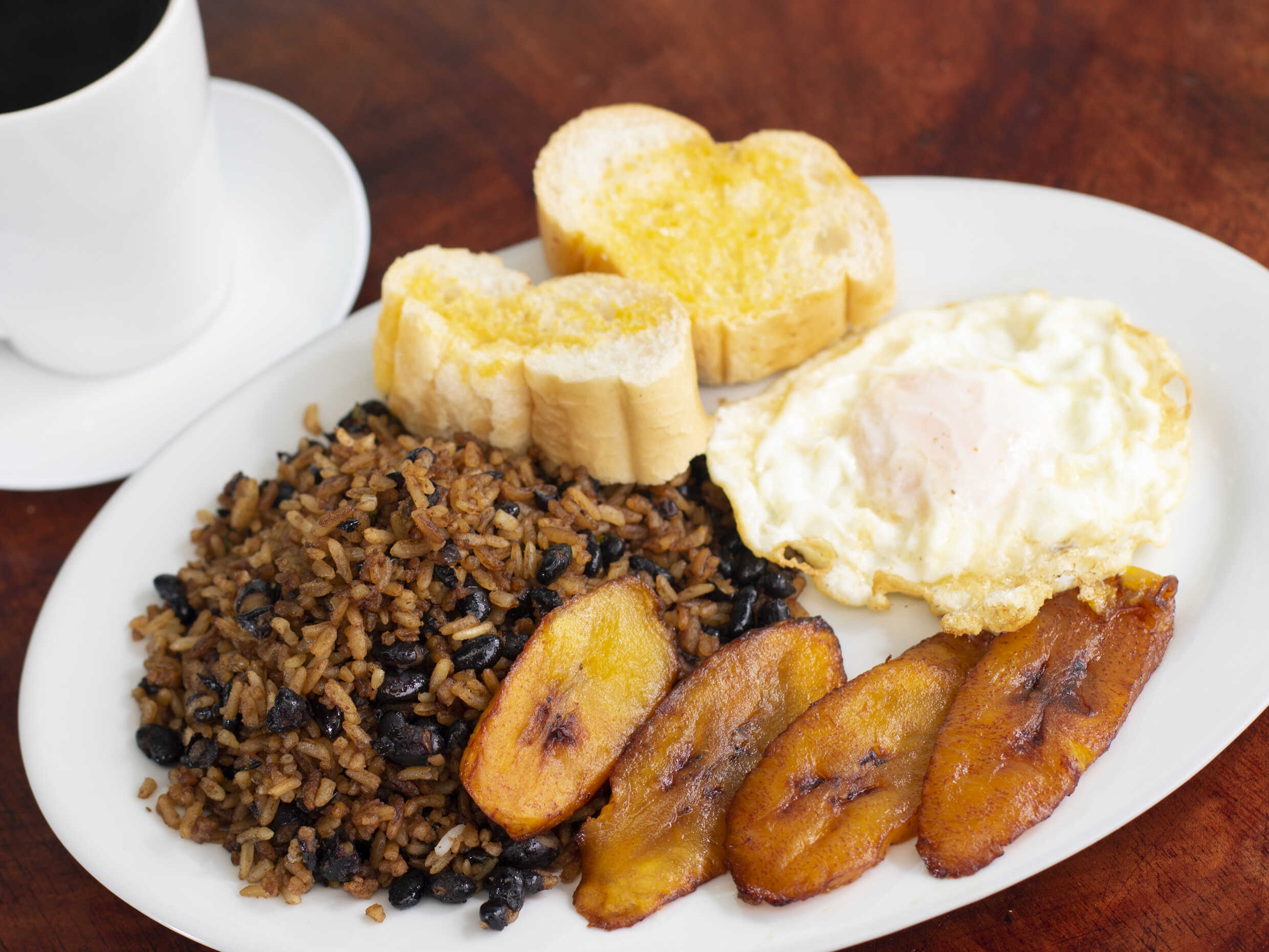 El pinto con todo viene acompañado de huevo a su gusto, salchichón, queso, carne, plátano maduro, pan.