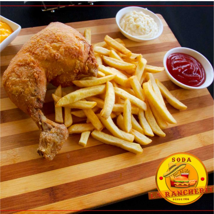 Muslo y cuarto empanizados, papas fritas, salsa de tomate y mayonesa.