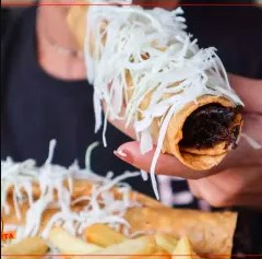 frijoles, queso y carne mechada de res dentro de una tortilla de trigo, lechuga, salsa de tomate, mayonesa y queso blanco rayado.
