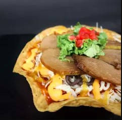 2 Tortillas grandes de maíz tostadas, carne mechada, repollo, lechuga, tomate, salsa queso, frijoles, mostaza, salsa de tomate y mayonesa.