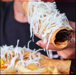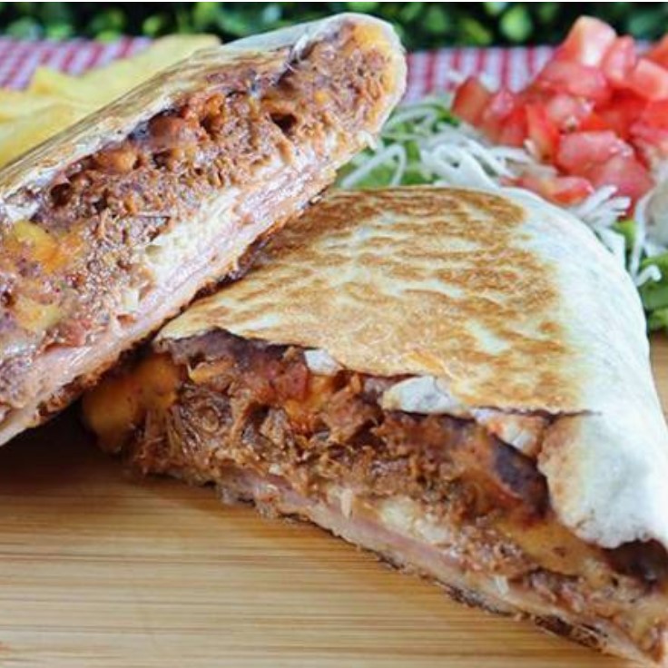 frijoles, queso y carne mechada de res dentro de una tortilla de trigo, lechuga, salsa de tomate, mayonesa y queso blanco rayado.