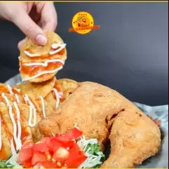 Muslo y cuarto empanizados, doraditas, salsa de tomate y mayonesa.