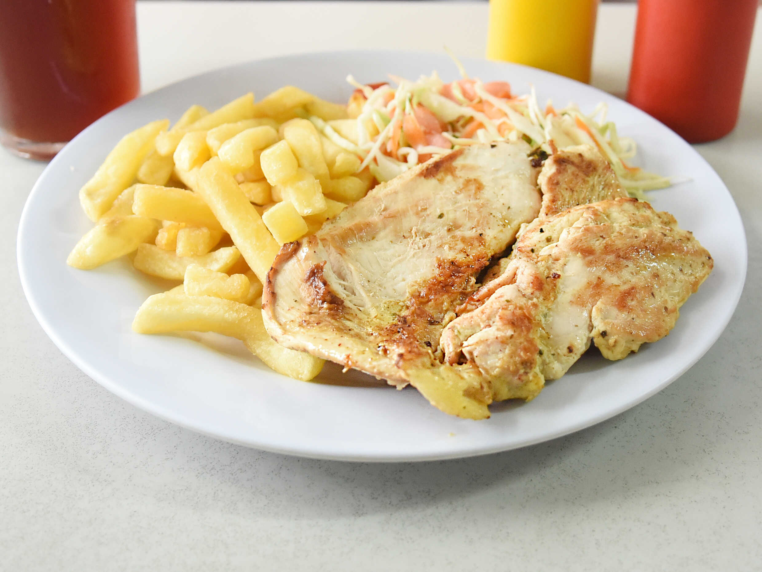 Pechuga acompañada de papas fritas y té frío.