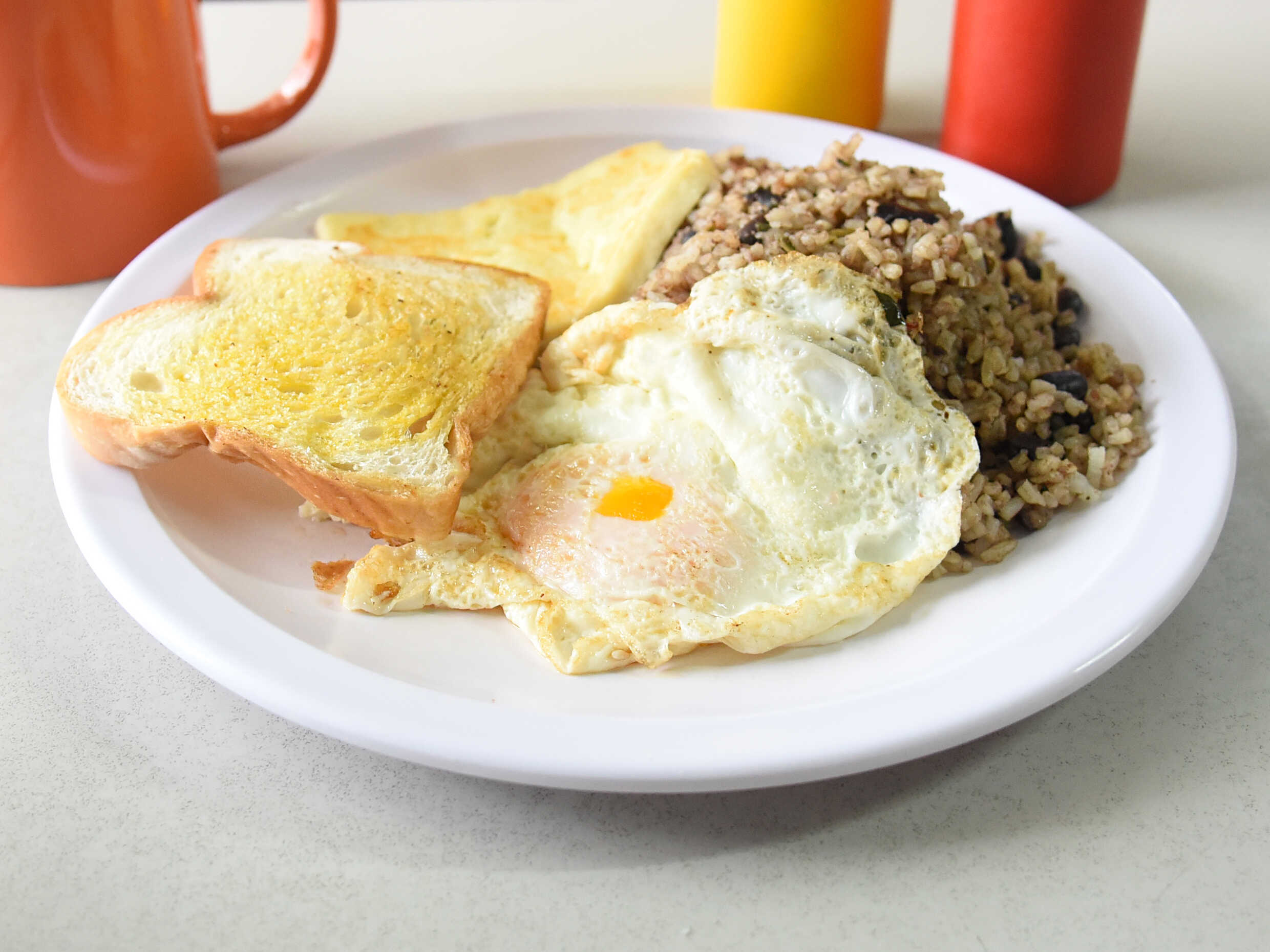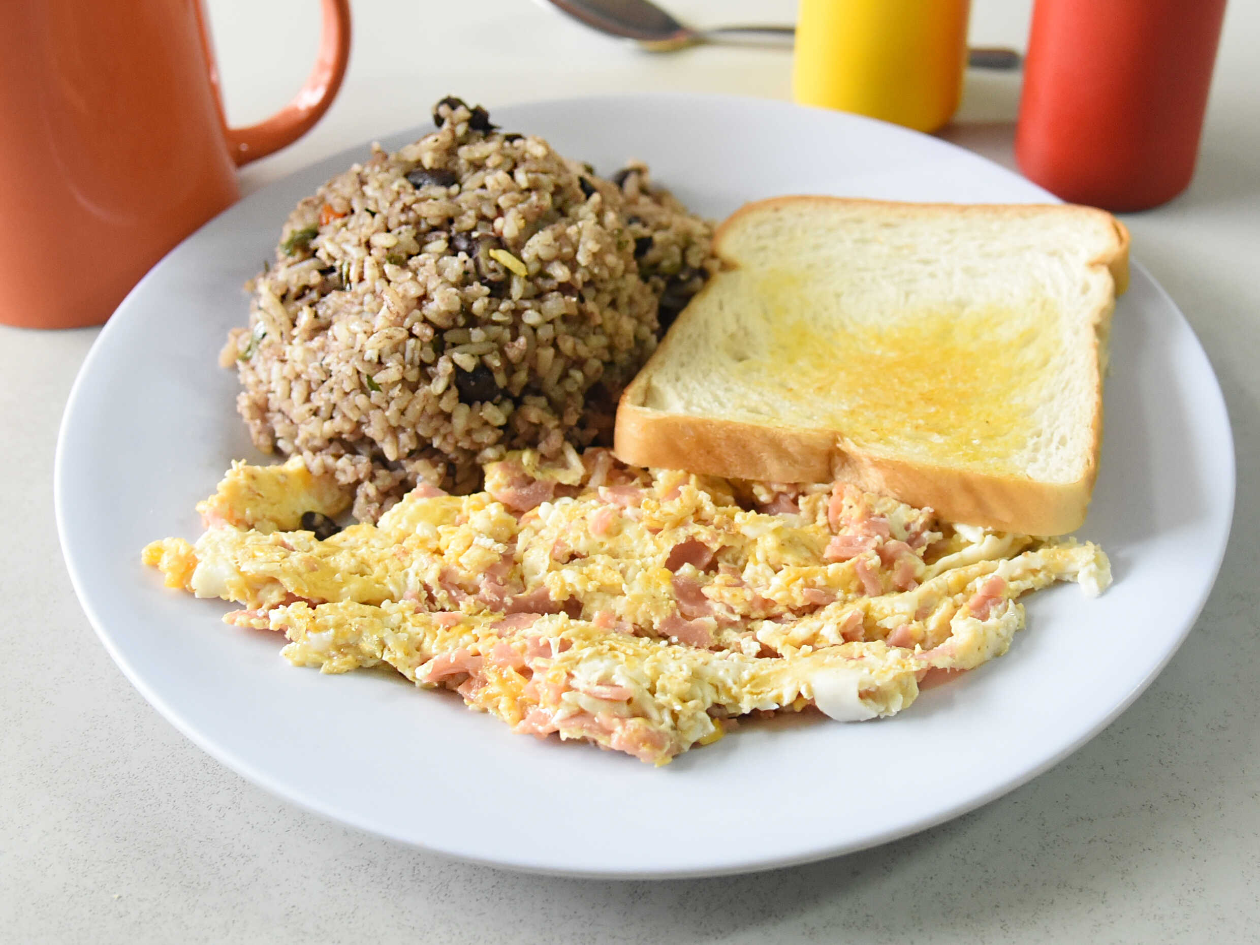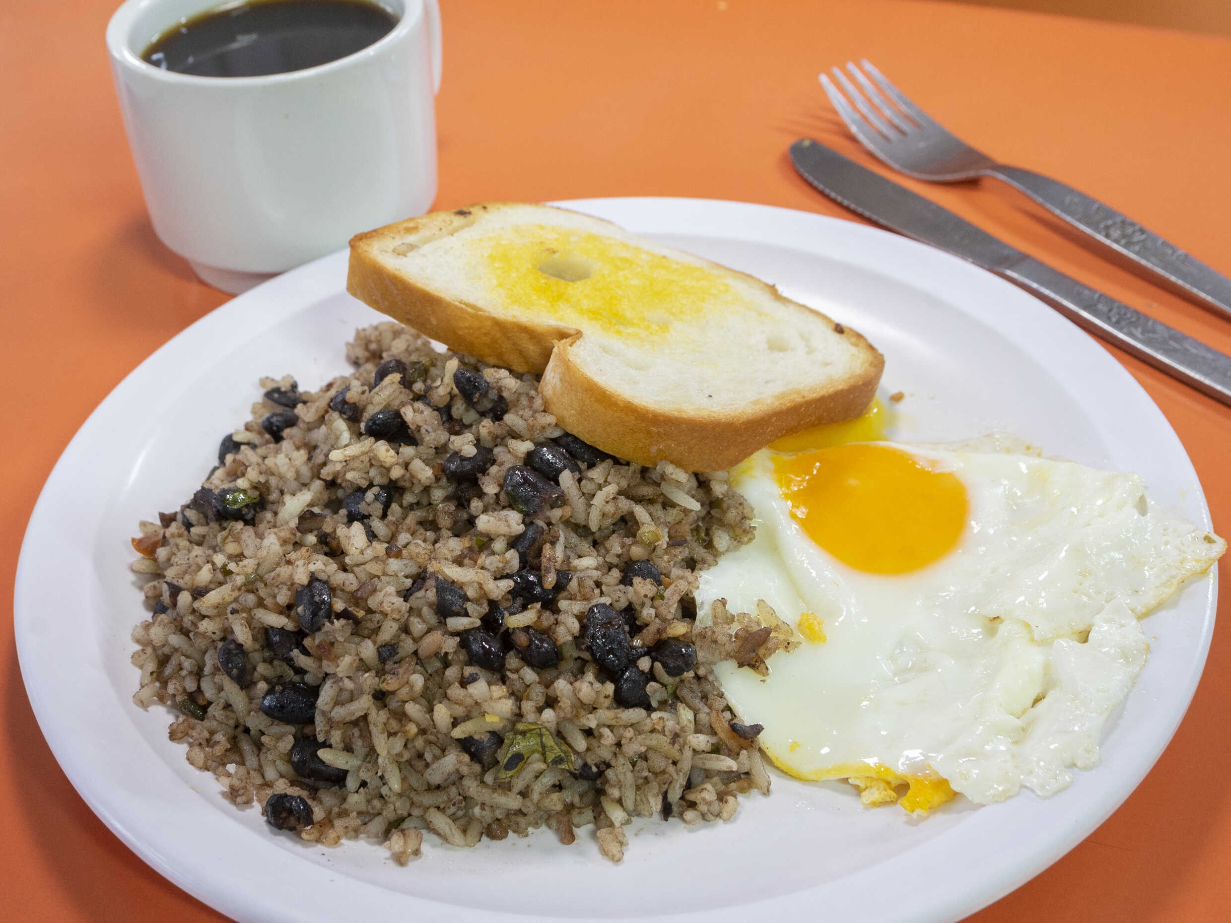 Gallo pinto con huevos y jamón, con tostadas y bebida a elegir.