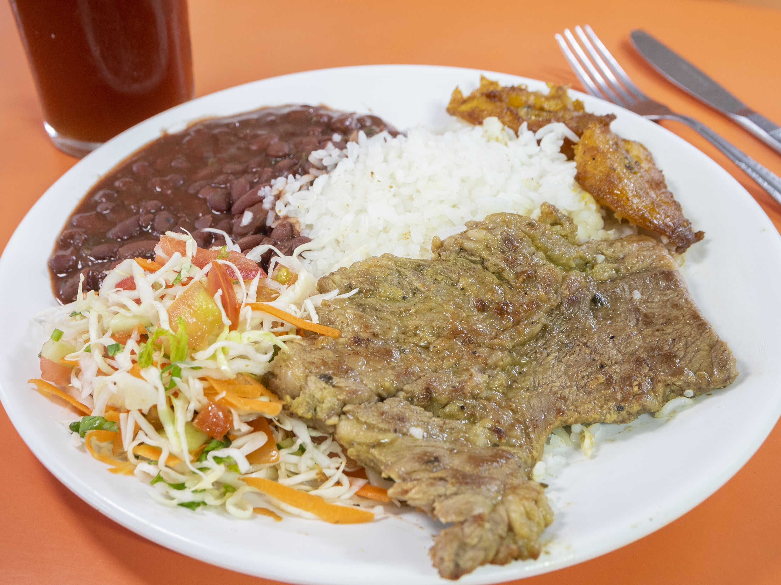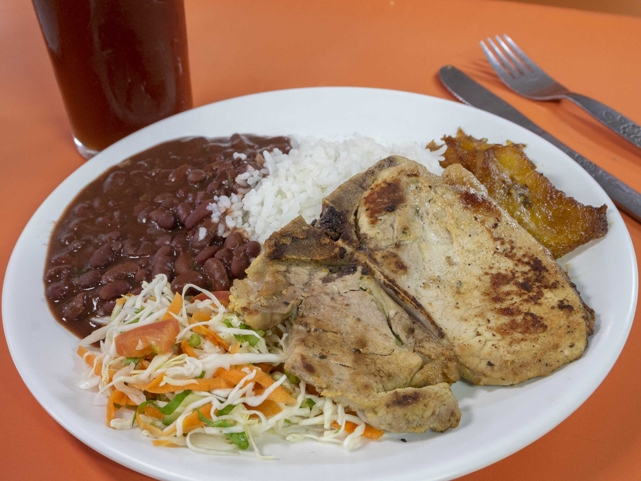 Casado, arroz, frijoles, ensalada, chuleta y té frío.