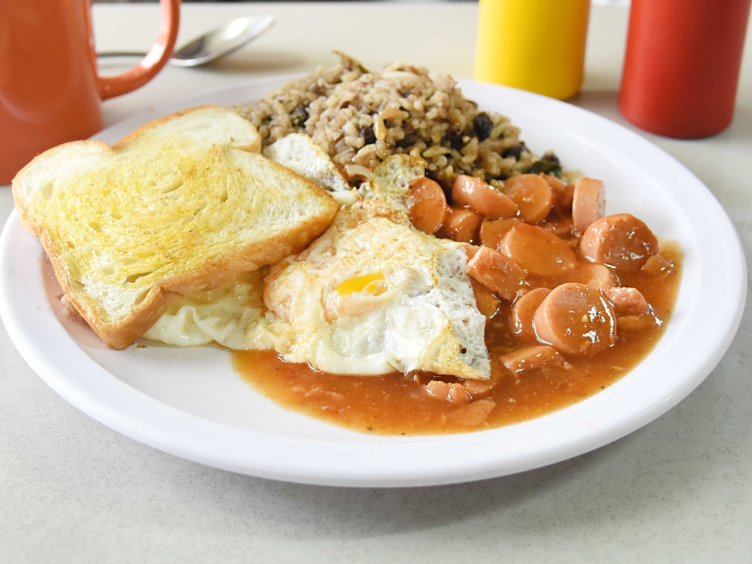 Desayuno: gallo pinto con huevo a elegir acompañado de salchicha o salchichón, 1 tostada, incluye tu bebida favorita de 12 oz entre café con leche, café negro, té frío ó chocolate.
