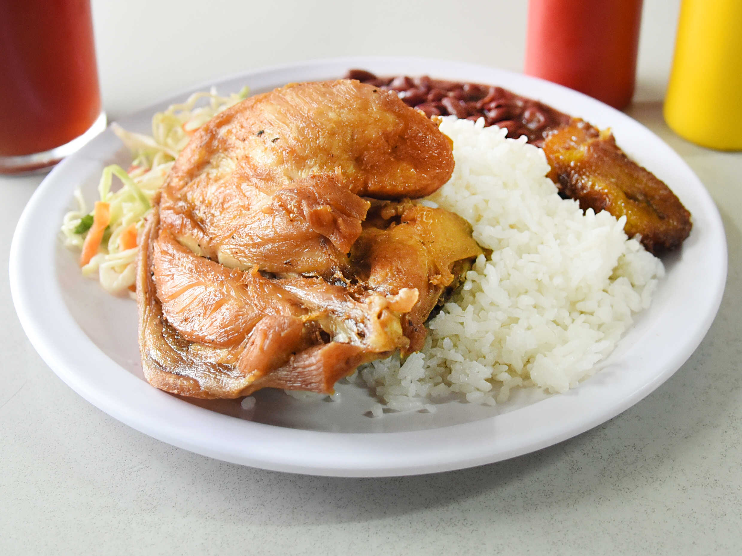 Casado, arroz, frijoles, ensalada, pollo y té frío.