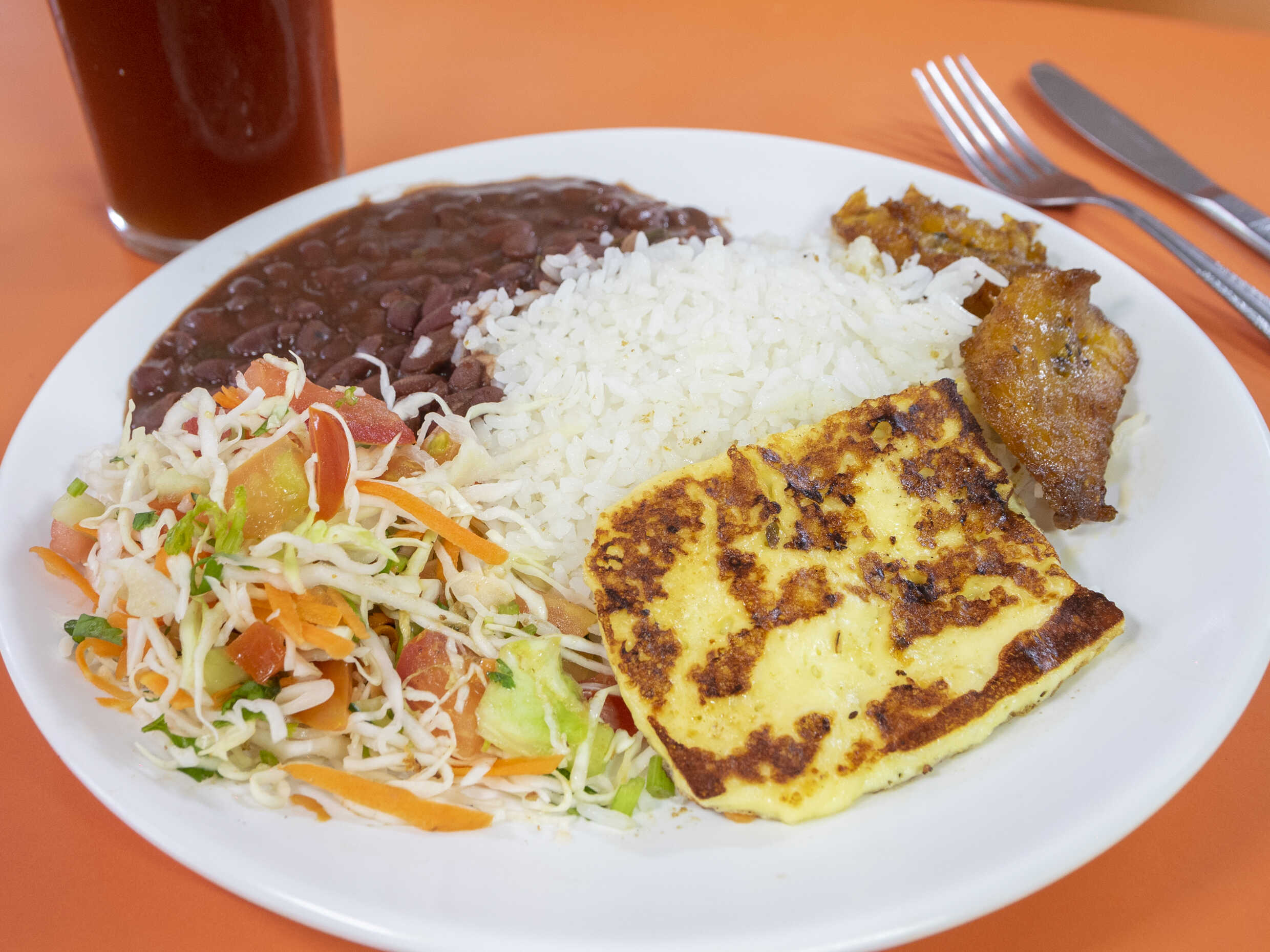 Arroz, frijoles, ensalada verde, maduros a escoger huevo frito, huevo picado ó queso frito y té frío.