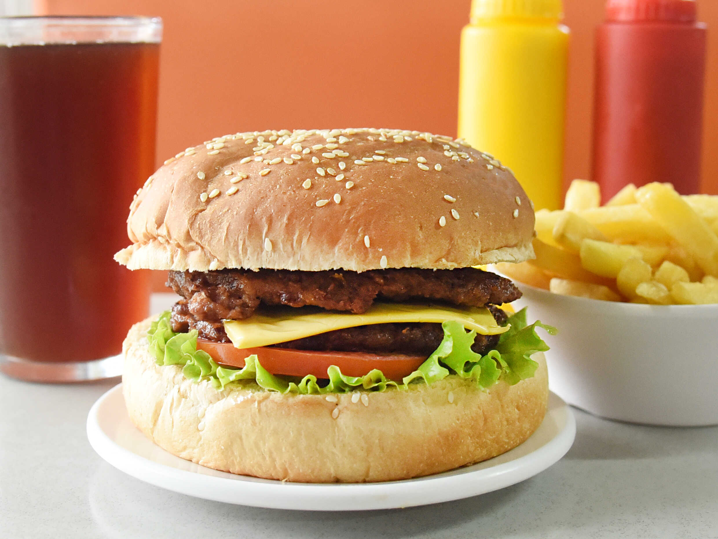 Quesoburguesa con queso, tomate, lechuga, papas y té frío.