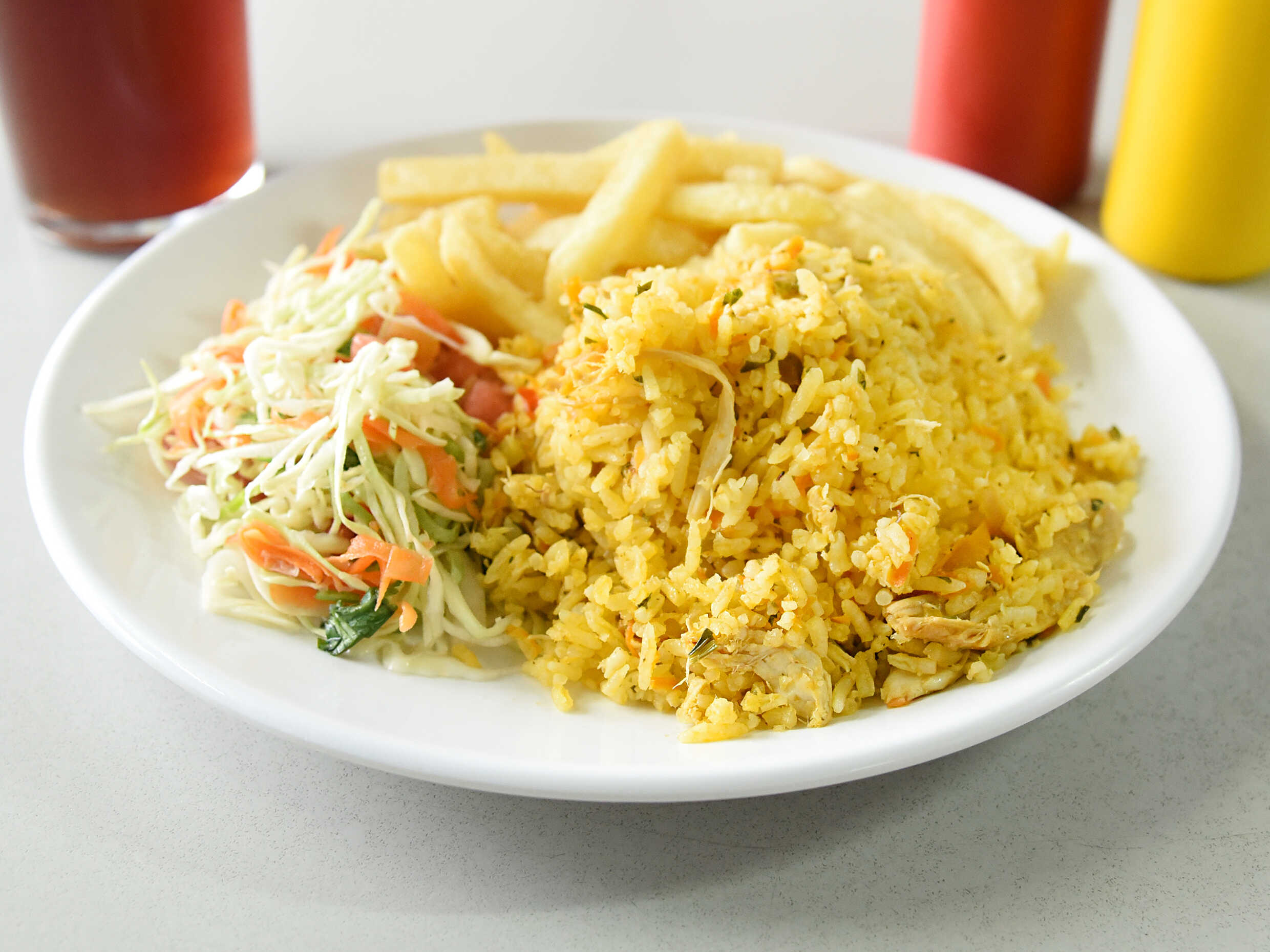 Arroz con pollo acompañado de papas, ensalada y te frío.