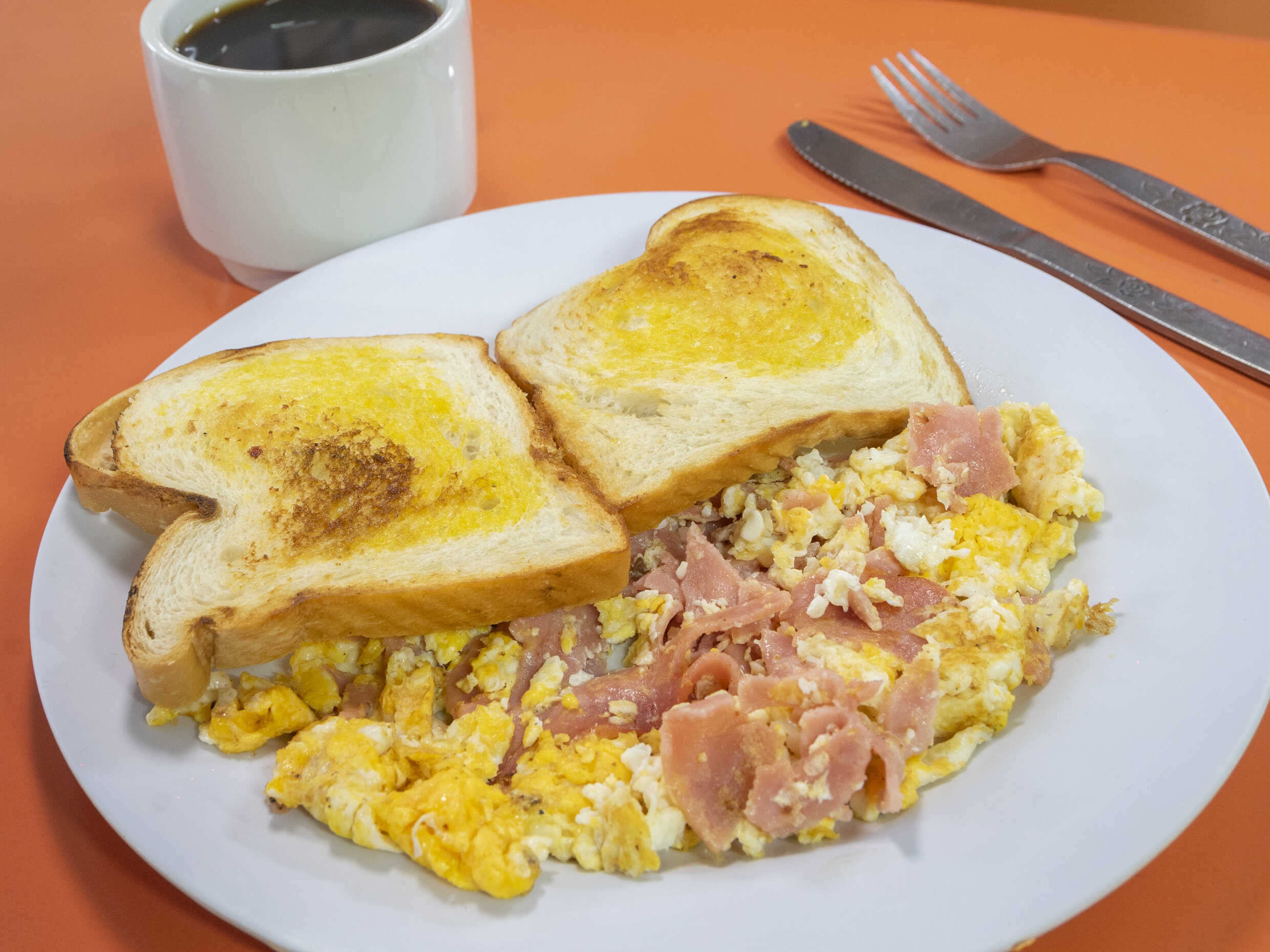 Desayuno estilo continental, huevos revueltos con jamón y tostada acompañado de bebida a elegir.