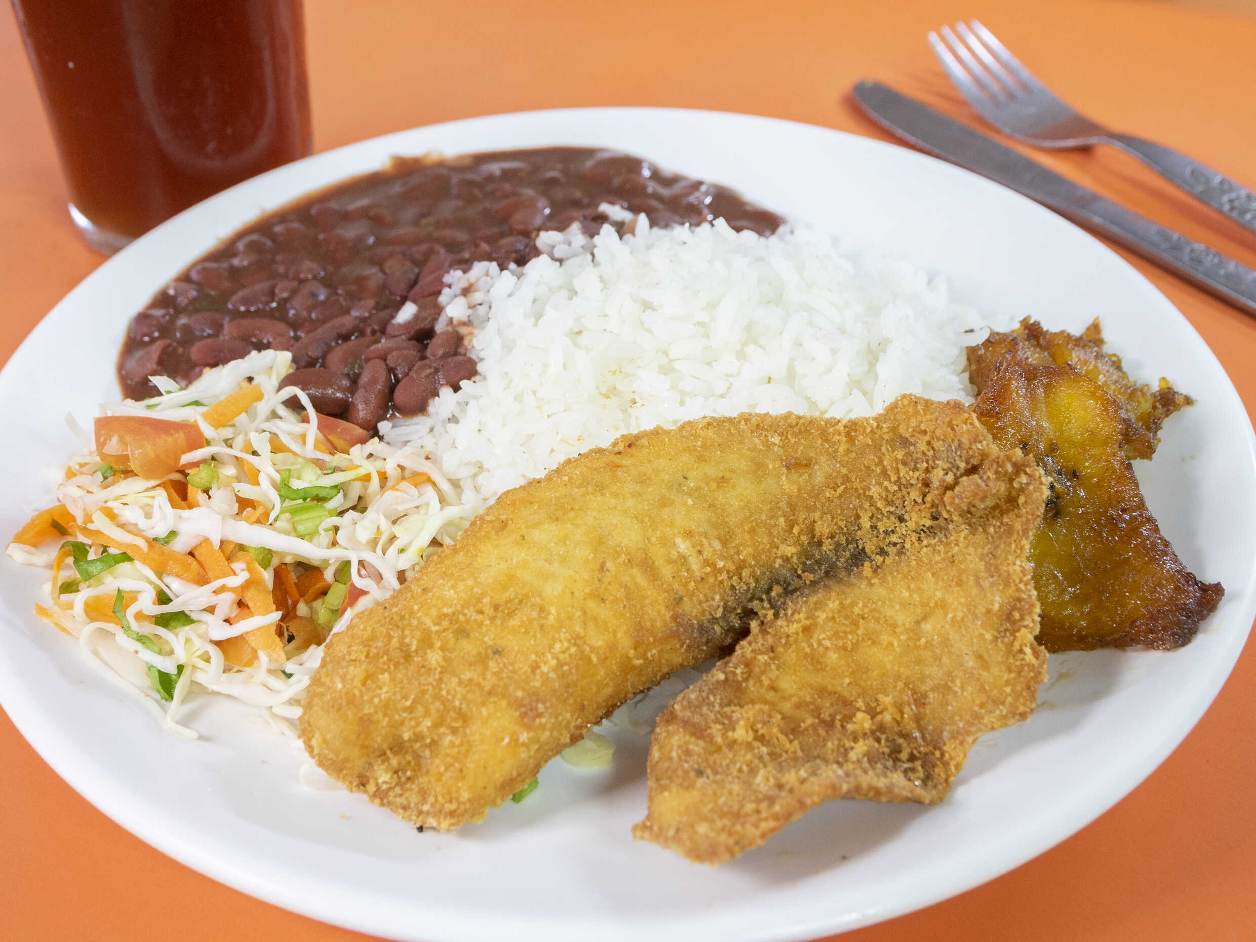 Casado, arroz, frijoles, ensalada, pescado y té frío.