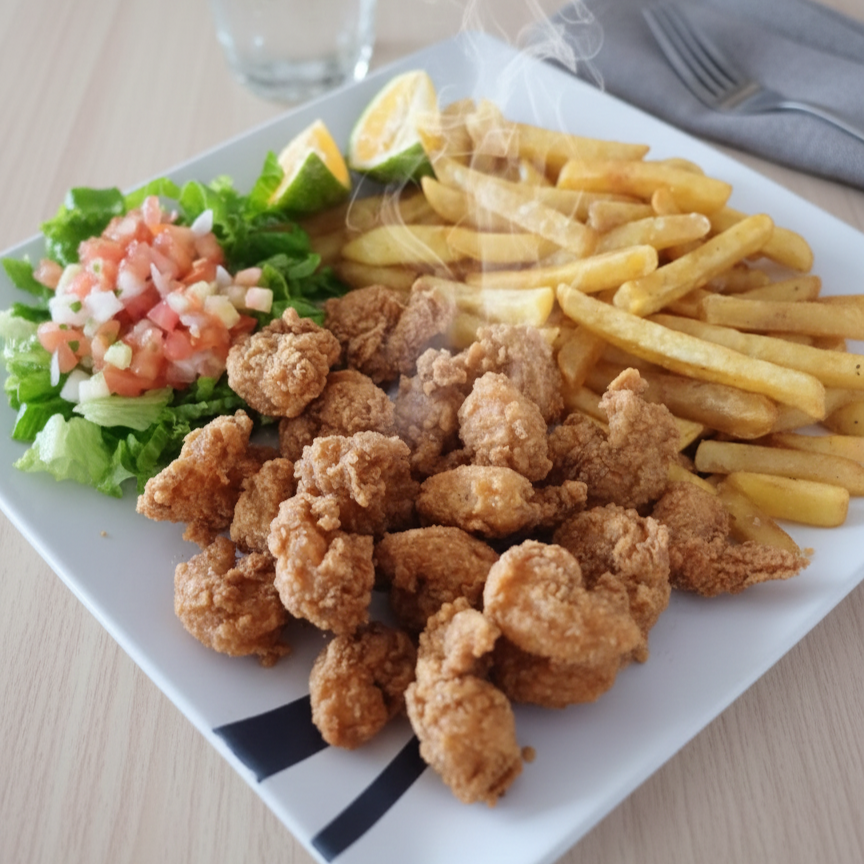 Camarones Empanizados y Papas Fritas