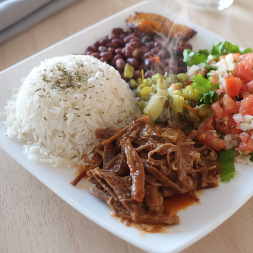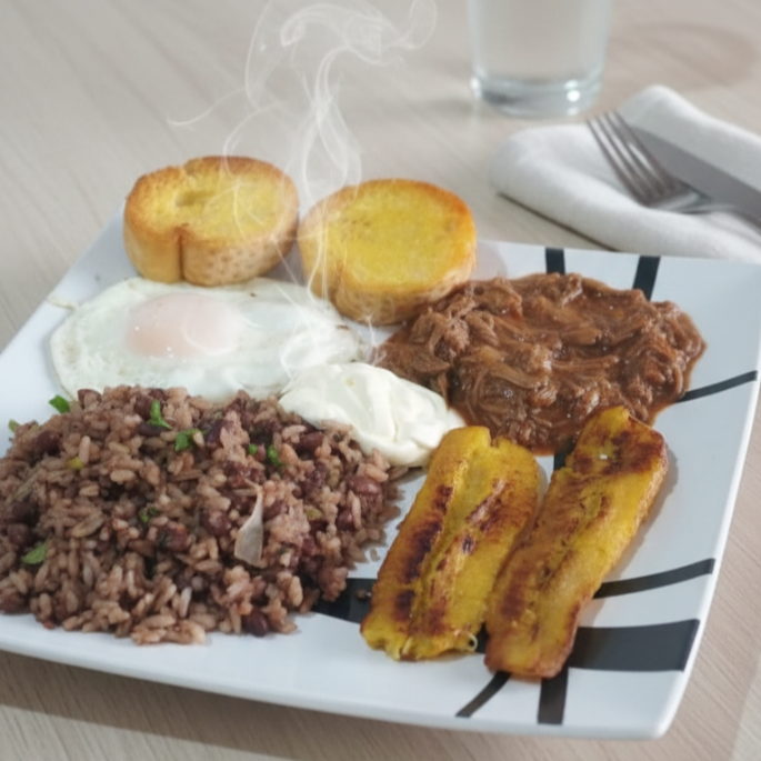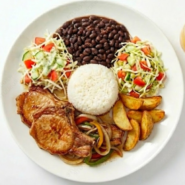 Arroz, frijoles, ensalada,picadillo, plátano maduro, proteína a elegir, bebida natural de la casa.