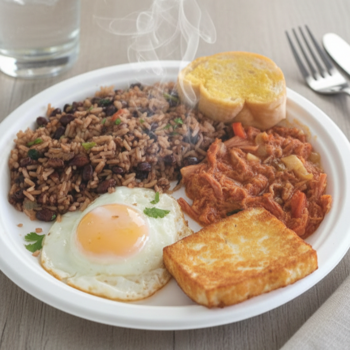 Pinto, huevo a elegir, queso frito, carne en salsa, pan, café.