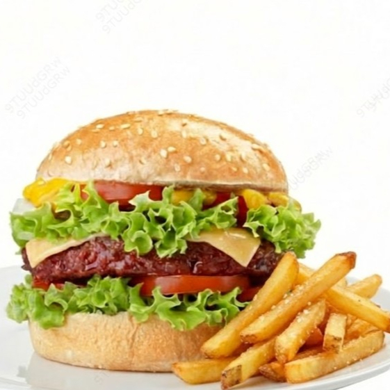 Hamburguesa con jamón y queso, con papas, con bebida