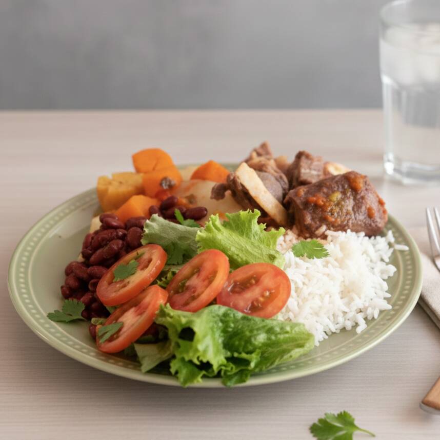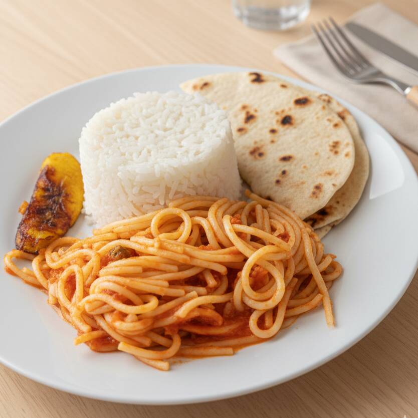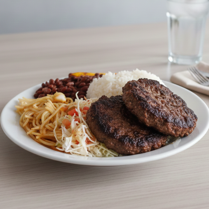 Arroz, frijoles, fideos, ensalada y torta de carne