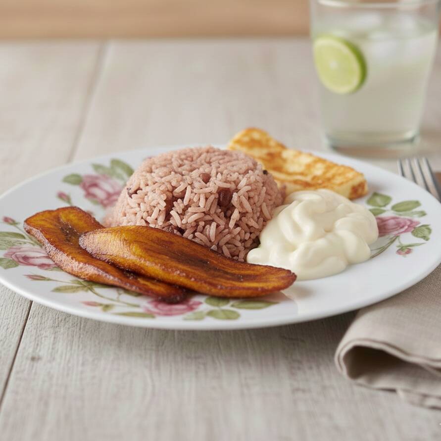 Delicioso gallo pinto con queso frito, natilla y plátano maduro.