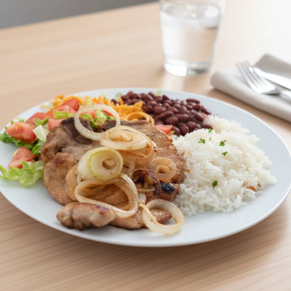 Arroz, frijoles, chuleta de cerdo, y ensalada del día para 1 sola persona