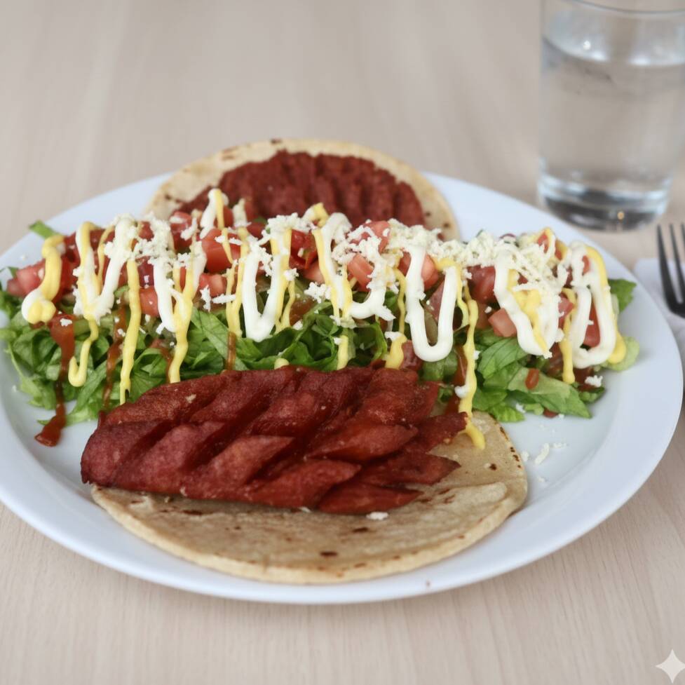 con tortilla casera, ensalada repollo con tomate y salsas de tomate mayonessa