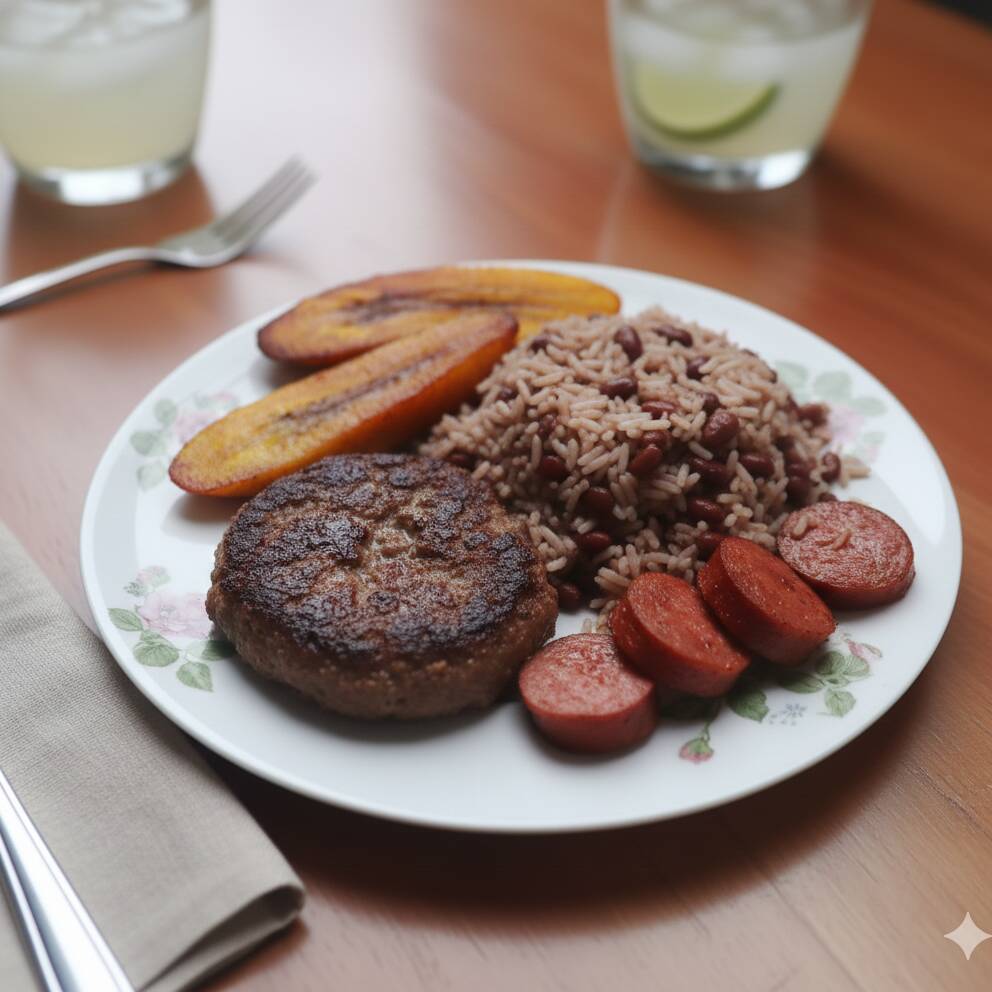 Delicioso pinto, con platano maduro, salchichon y torta de carne