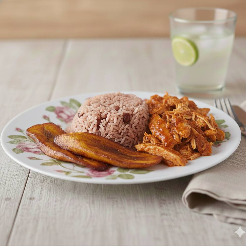 Delicioso gallo pinto con pollo en Salsa y tiras de plátano maduro