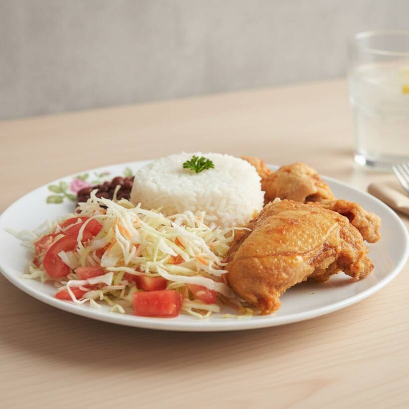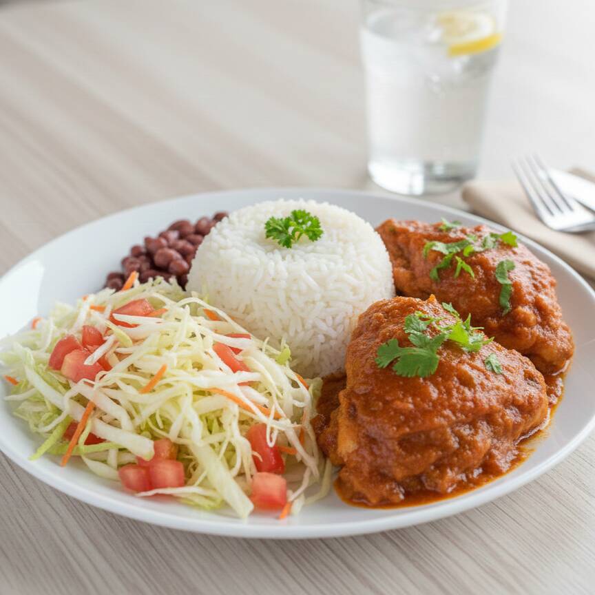 Arroz, frijoles, una pieza pollo en salsa de tomate, plátano maduro y ensalada del dia