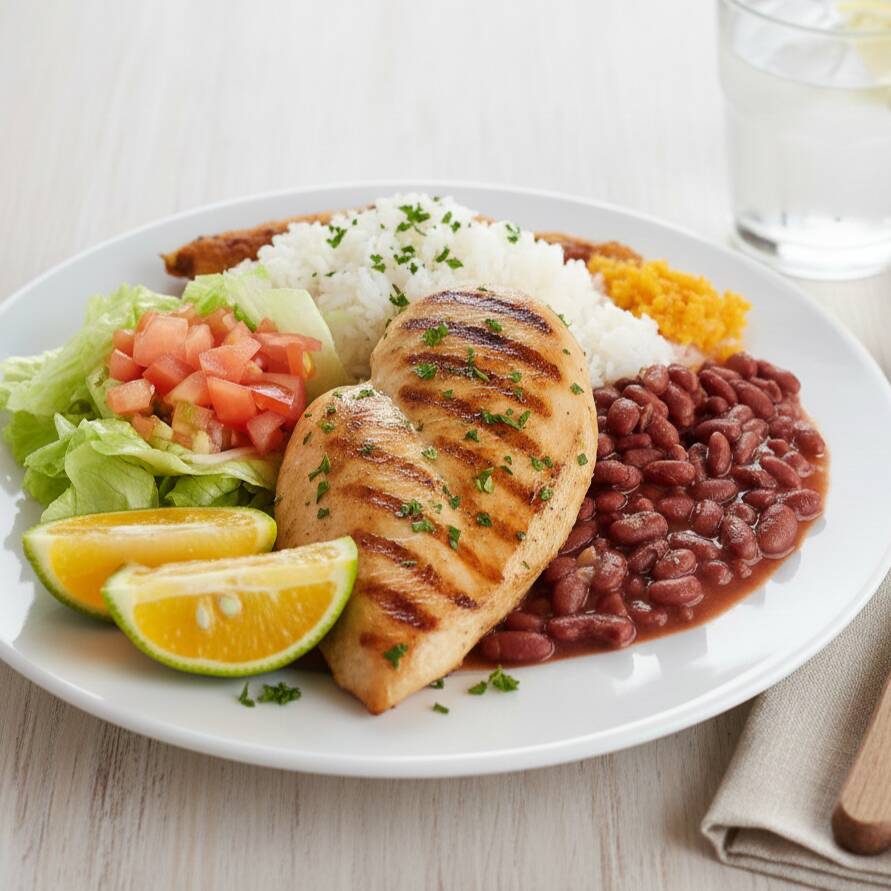 Arroz, frijoles, fideos, ensalada y pollo a la plancha.