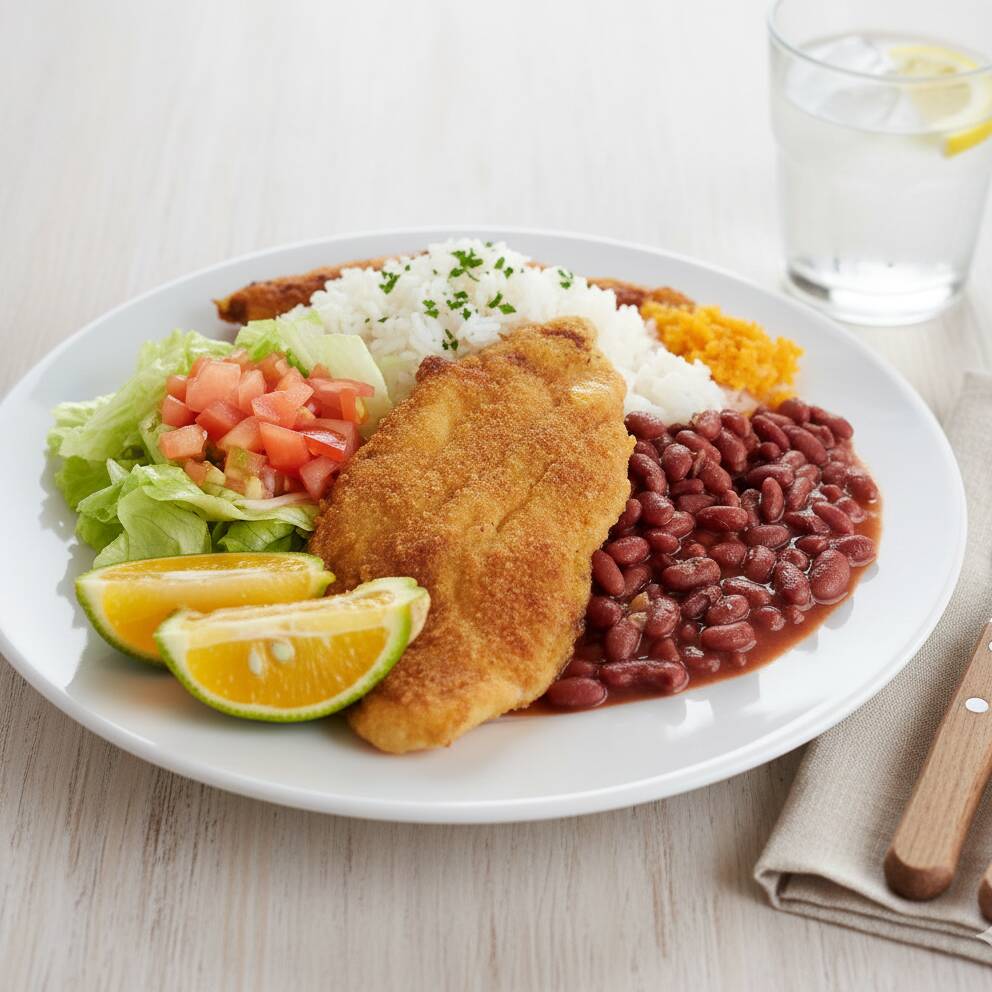 Arroz, frijoles, 100gr filete de pescado, fideos, plátano maduro, y ensalada del día.